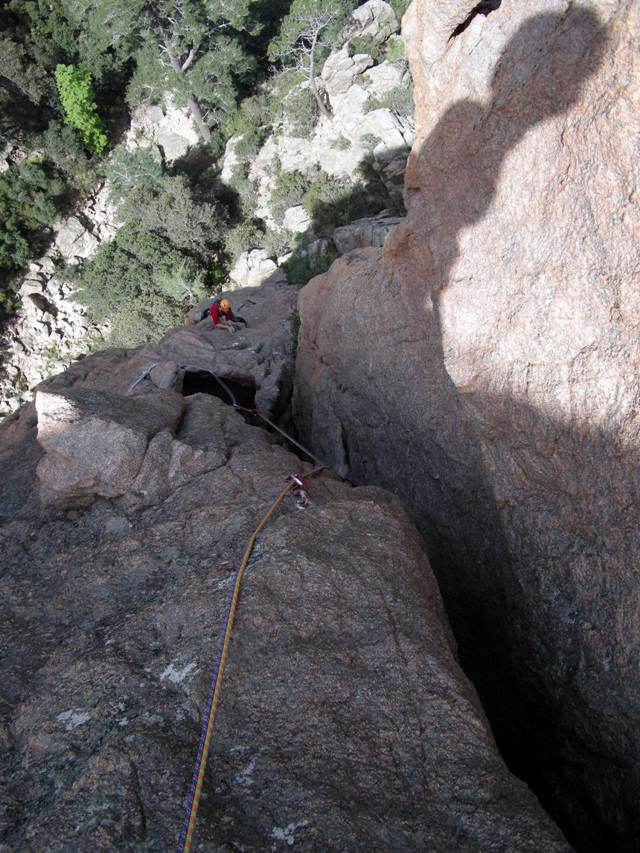 die letzte Seillänge die wir klettern – man kann gut die Autos am Parkplatz erkennen