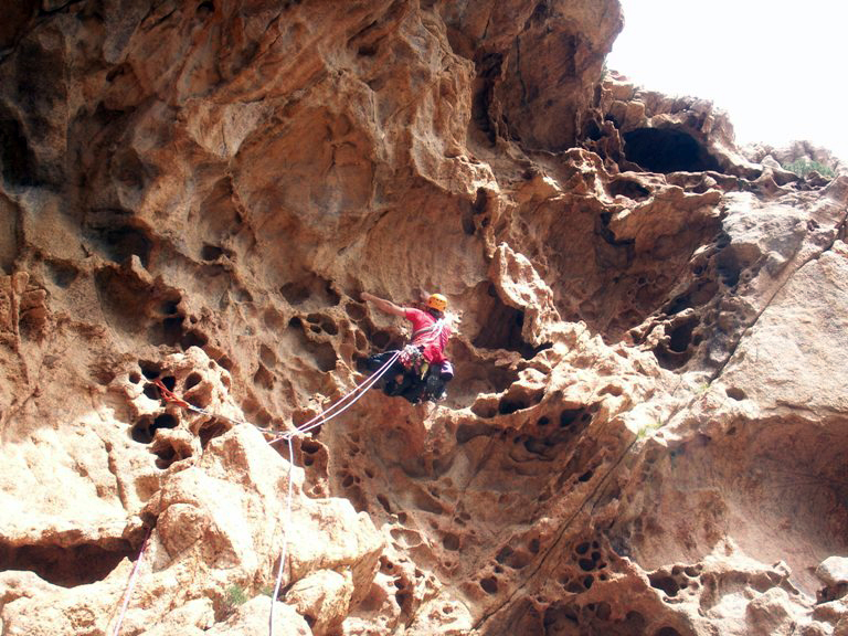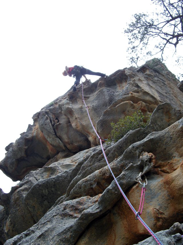 Die letzten drei Seillängen (5c, 6a, 4b+) waren dann waschelnass, weiter abgesichert und recht heikel zu klettern, da man von den Tritten ständig wegrutschte.